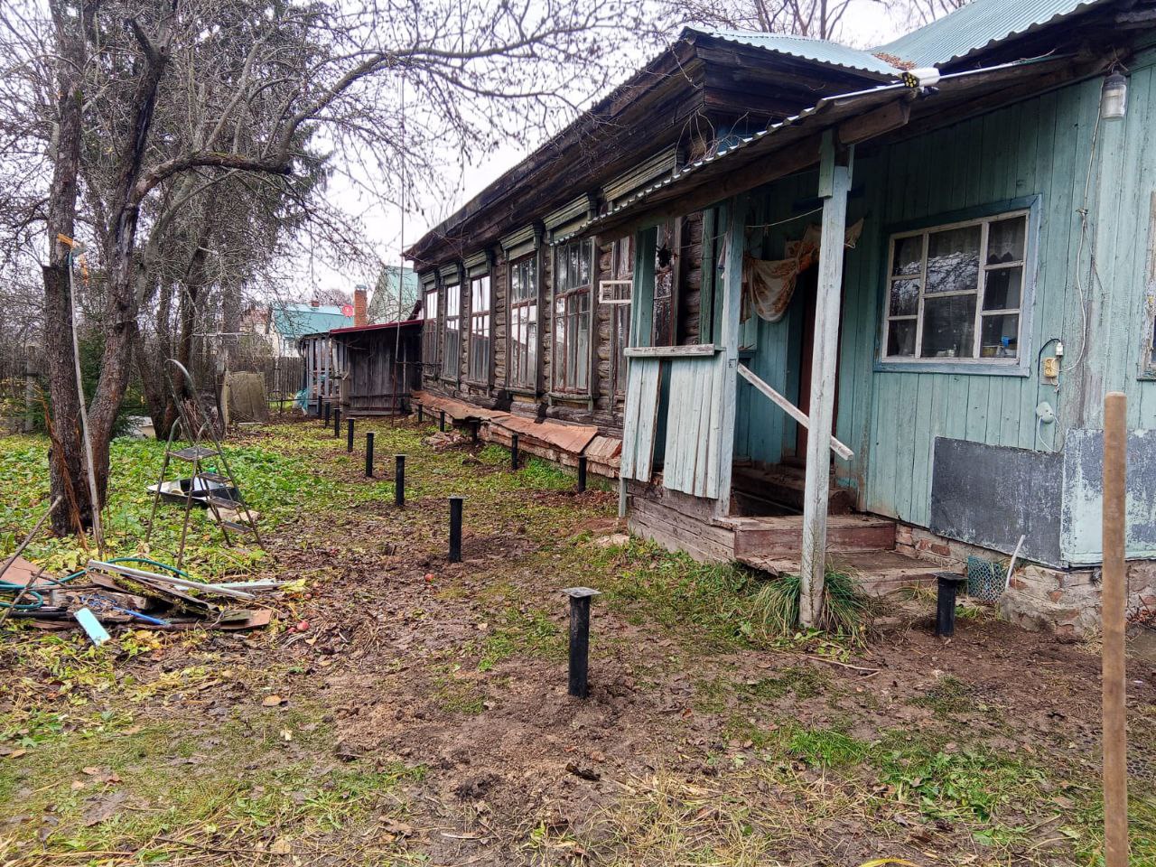 В назначенный день наша бригада прибыла на объект. Первым делом была выполнена точная разметка свайного поля. Согласно проекту, мы расположили сваи в два идеально ровных ряда. Первый ряд прошел в непосредственной близости к стене бревенчатого дома, а второй ряд определил внешний край будущей террасы, задавая ее ширину.